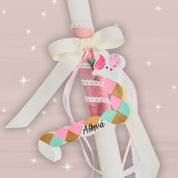 Προσωποποιημένη χειροποιητη Χειροποίητη Λαμπάδα με Ξύλινo Μονόκερο παιχνίδι, με Όνομα, Έτος, η διαφορετική λαμπάδα που η Νονά μπορεί να προσφέρει τις ευχές της στο βαφτιστήρι της αυτό το Πάσχα.