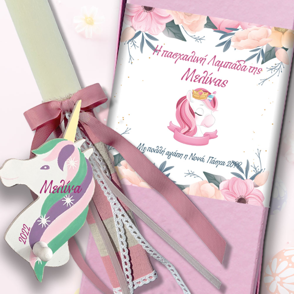 Κρεμάστρα Μονόκερος σε Χειροποίητη Λαμπάδα & Κουτί με Ονόματα πολυτελές χάρτινο, από την Νονά, για να ευχηθείτε Χρόνια Πολλά και καλό Πασχα σε κάθε Κορίτσι.