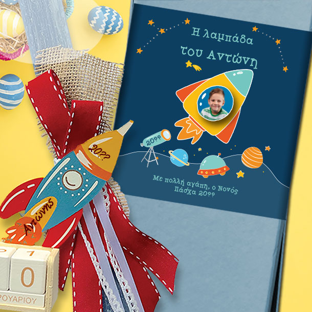 Επιλέξτε μια από τις Προσωποποιημένες Χειροποίητες Πασχαλινές Λαμπάδαες από το familyandfriends.gr, με διακοσμητικά που είναι προσωποποιημένα και μένουν αναμνηστικά για πάντα. Ο Ξύλινος Πύραυλος Ημερολόγιο με Όνομα σε Κουτί με Λαμπάδα Πασχαλινή χειροποίητη είναι το ξεχωριστό δώρο κάθε νονάς αυτό το πασχα στο βαφτιστήρι τους. Επιλέξτε μια από τις Προσωποποιημένες χειροποίητες πασχαλινές Λαμπάδες με ή χωρίς το αντίστοιχο κουτί που θα είναι ξεχωριστή από όλες τις λαμπάδες που προσφέρατε μέχρι σήμερα.