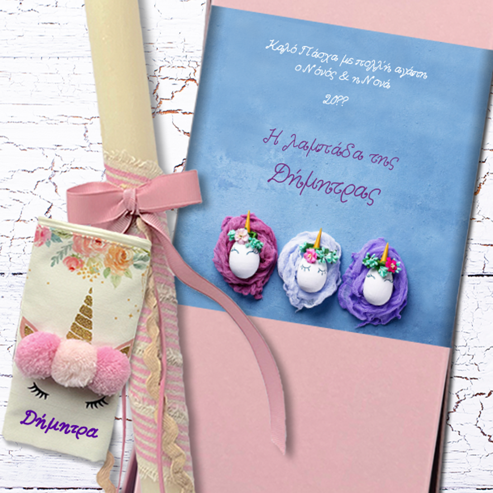 Πασχαλινή Χειροποίητη Λαμπάδα με Τσαντάκι Μονόκερος με Όνομα σε Λαμπάδα & Κουτί με Ευχές Προσωποποιημένη, η οποία έχει διακοσμητικό με το όνομα του παιδιού, μαζί με το Προσωποποιημένο κουτί με τις ευχές σας.