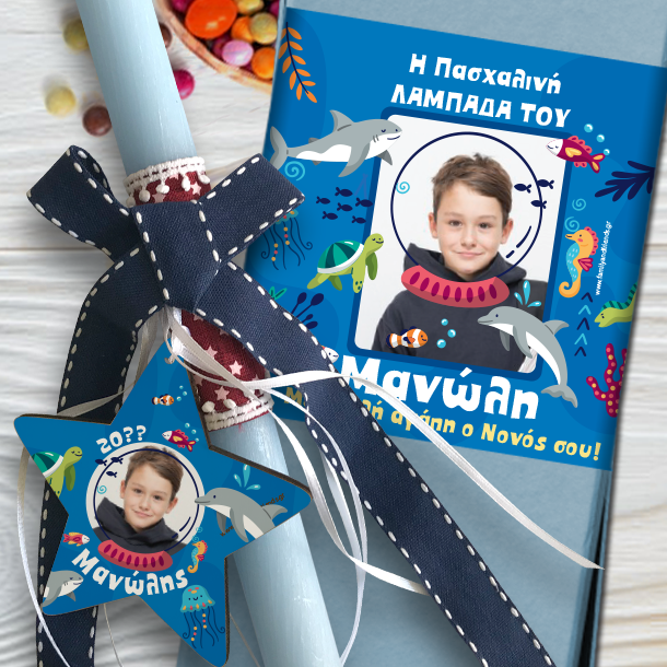 Κουτί με Λαμπάδα και Διακοσμητικό Αστέρι με Φωτογραφία, Όνομα, Ευχές, Χειροποίητη, σε προσωποποιημένο κουτι πολυτελές χάρτινο, δώρο από την Νονά, για να ευχηθεί Χρόνια Πολλά και καλό Πασχα σε κάθε αγόρι.
