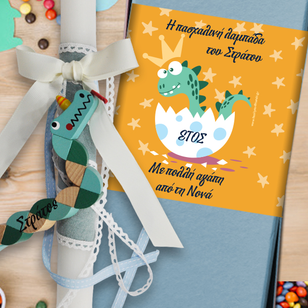 Αυτό το πάσχα η Λαμπάδα της νονάς μένει αναμνηστικό για πάντα, γιατί είναι ξεχωριστή και προσωποποιημένη με Παιχνίδι Δεινόσαυρος σε Λαμπάδα & Κουτί με Ονόματα, Ευχές, Χειροποίητη.