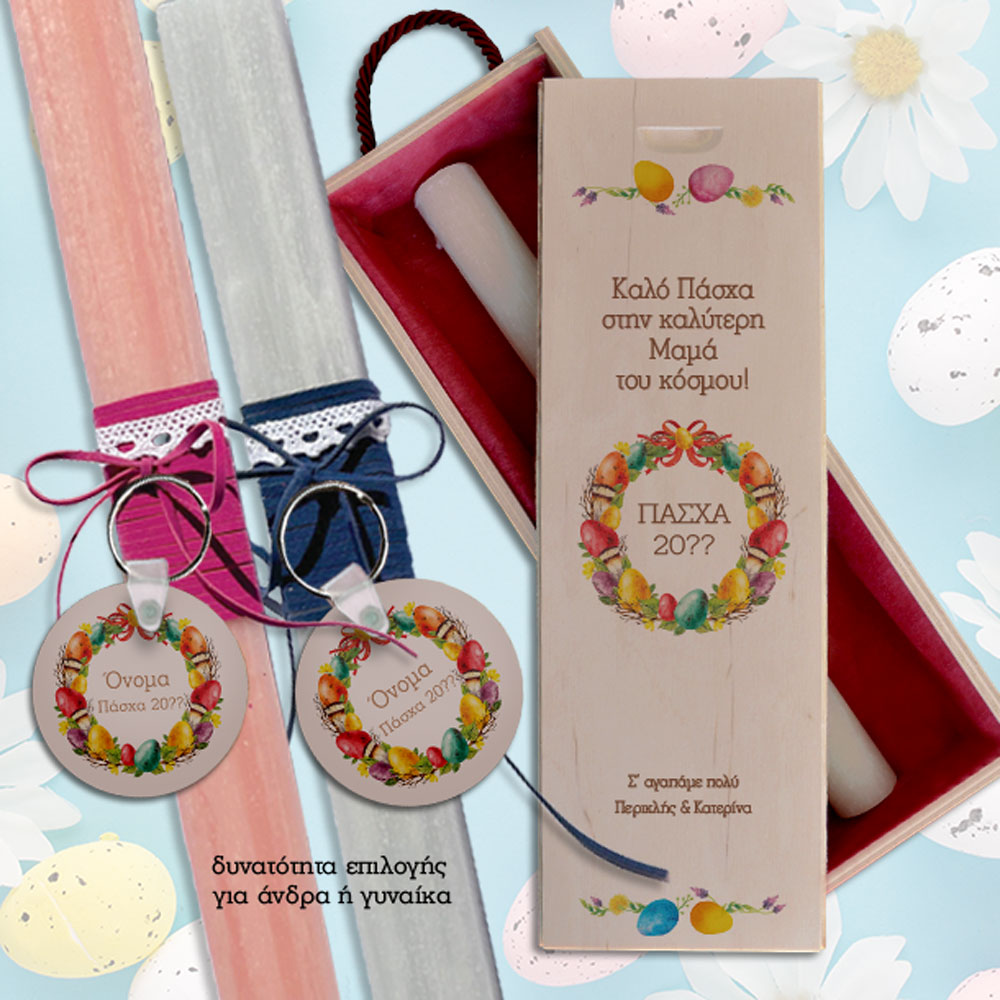 Προσωποποιημένες πασχαλινές Χειροποίητες Λαμπάδες με Ευχές σε ξύλινο κουτί & Μπρελόκ με Ονόματα, Για Γυναίκες & άνδρες πασχαλινό δώρο στην Μαμά & τον Μπαμπά που θα τους εντυπωσιάσει αυτό το Πάσχα. Ευχηθείτε Καλό Πάσχα & Χρόνια Πολλά, στην Νονά & τον Νονό με δυο πρωτότυπες Προσωποποιημένες πασχαλινές Χειροποίητες Λαμπάδες με Ευχές σε ξύλινο κουτί & Μπρελόκ με Ονόματα και τις ευχές σας στο κουτί της λαμπάδας.
