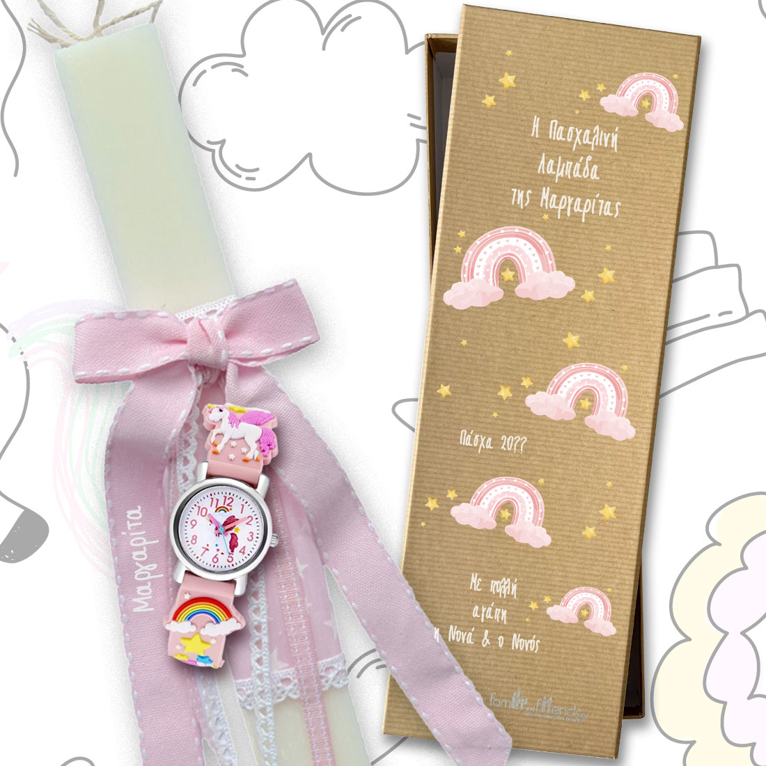 Στο familyandfriends.gr θα βρείτε μοναδικά προσωποποιημένα Πασχαλινά δώρα, γενεθλίων και δώρα γιορτών προσωποποιημένα για αγόρια και κορίτσια, άνδρες και γυναίκες. Χειροποίητη Πασχαλινή Λαμπάδα με Όνομα & δώρο Ρολόι, είναι το πρωτότυπο δώρο που θα κάνει η νονά στο βαπτιστήρι της, η θεία στο ανιψάκι της, η γιαγια στο αγαπημένο της εγγονάκι.