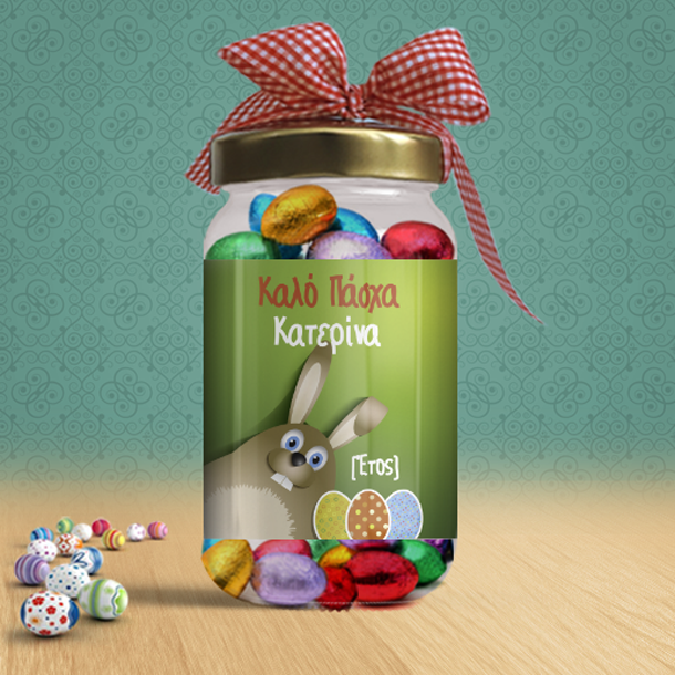 Β. Μεγάλο Βαζάκι με Σοκολατένια Αυγουλάκια: Γυάλινο Βαζάκι 15cm ύψος, 7,5cm Διάμετρος, περίπου 450γρ. Σοκολατένια Αυγουλάκια Ετικέτα 4χρωμη εκτύπωση