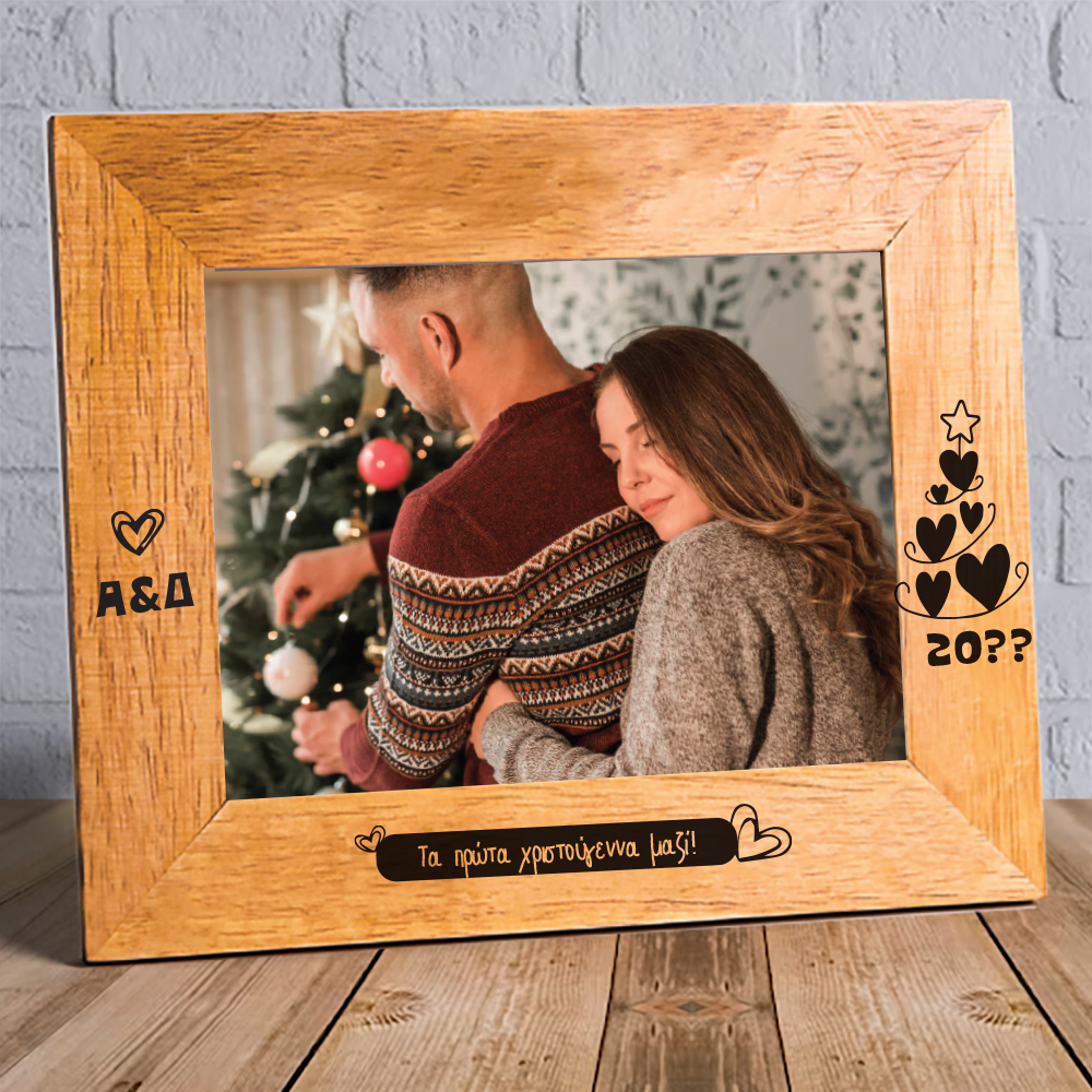 Πρωτότυπη Ξύλινη Κορνίζα τα πρώτα μας Χριστούγεννα με Ονόματα, Μήνυμα, Φωτογραφία, για ζευγάρια, ενα διαφορετικό χριστουγεννιάτικο δώρο για την γυναίκα σας ή τον άνδρα σας. Για ζευγάρια που θα περάσουν μαζί τα πρώτα τους Χριστούγεννα ένα ξεχωριστό προσωποποιημένο δώρο Χριστουγέννων τα Πρώτα Χριστούγεννα μαζί με Ονόματα.