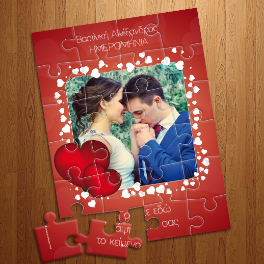 Δώρο Παζλ με Φωτογραφία και μήνυμα που θέλετε για την γιορτή του Αγίου Βαλεντίνου ή την επέτειο σας για να εκφράσετε την αγάπη σας με ένα ξεχωριστό τρόπο και με ένα μοναδικό και προσωπικό δώρο. Ένα μοναδικό δώρο, Παζλ  με Φωτογραφία και μήνυμα που θέλετε, ονόματα και ημερομηνία, είναι το Δώρο για Ερωτευμένους που ξεχωρίζει, για την γιορτή του Αγίου Βαλεντίνου, την κάθε επέτειο ερωτευμένου ζευγαριού. Εκφράστε την αγάπη σας με ένα ξεχωριστό τρόπο και με ένα μοναδικό και προσωπικό δώρο που δημιουργεί μοναδικές στιγμές όπως το Παζλ 35 κομμάτια με Φωτογραφία και μήνυμα που θέλετε, ονόματα σε σχήμα καρδιάς για την επέτειο 1 ετους, 2, 3, 4, 5 ετων σχέσης κάθε ζευγαριου. Παζλ για γιορτή των ερωτευμένων και για κάθε επέτειο, επετείους με Φωτογραφία, ονόματα με το Όνομα το δικό σας και του φίλου ή της φίλης σας και ημερομηνία, μπορεί να δοθεί σαν δώρο στο αγορι σας ή το κοριτσι σας, με αφορμή τα γενέθλια ή την γιορτή κάθε ερωτευμένου ζευγαριού. Πρωτότυπο προσωποποιημένο δωρο, Παζλ 120 κομμάτια με Φωτογραφία και μήνυμα που θέλετε που μπορεί να δοθεί από την σύζυγο στο σύζυγο για να εκφράσει όλα τα συναισθήματα κμε αφορ΄μη την επετειο ή τα γενεθλια αι δημιουργεί μοναδικές αναμνήσεις για πάντα. Κάντε και εσείς ένα μοναδικό Παζλ 300 κομμάτια με Φωτογραφία και μήνυμα που θέλετε, στην Γυναίκα σας ή τον ανδρα σας με αφορμή την όποια επέτειο γιορτάζετε. Συνδυάστετο με ένα διαφορετικό Προσωποποιημένο Διακοσμητικό Μαξιλάρι σε σχήμα Καρδιάς με Όνομα για να ευχηθείται χρόνια πολλά στον φίλο ή τον φίλο σας με αφορμή τα γενέθλια την γιορτή ή όποια επέτειο γιορτάζετε. Μπορείτε επίσης να τη συνδυάσετε με μια προσωποποιημένη σοκολάταγια δώρο στην γιορτή του Αγίου Βαλεντίνου ΠΕΡΙΓΡΑΦΗ Παζλ από σκληρό χαρτί με γυαλιστερή επιφάνεια Διάσταση 20 εκ Χ 28 εκ 32 κομμάτια σε κουτί με αυτοκόλλητο με το σχέδιο σας. Το χρώμα της συσκευασία σας δώρου εξαρτάται από την διαθεσιμότητα