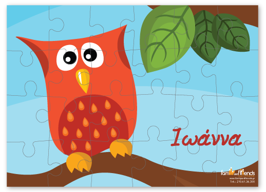 Παζλ με κόκκινη κουκουβάγια πάνω σε κλαδί, με όνομα παιδιού.