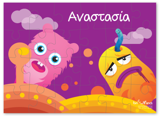 Μοβ Παζλ με τερατάκια για παιχνίδι για κοριτσάκι, με το όνομα που θέλετε.