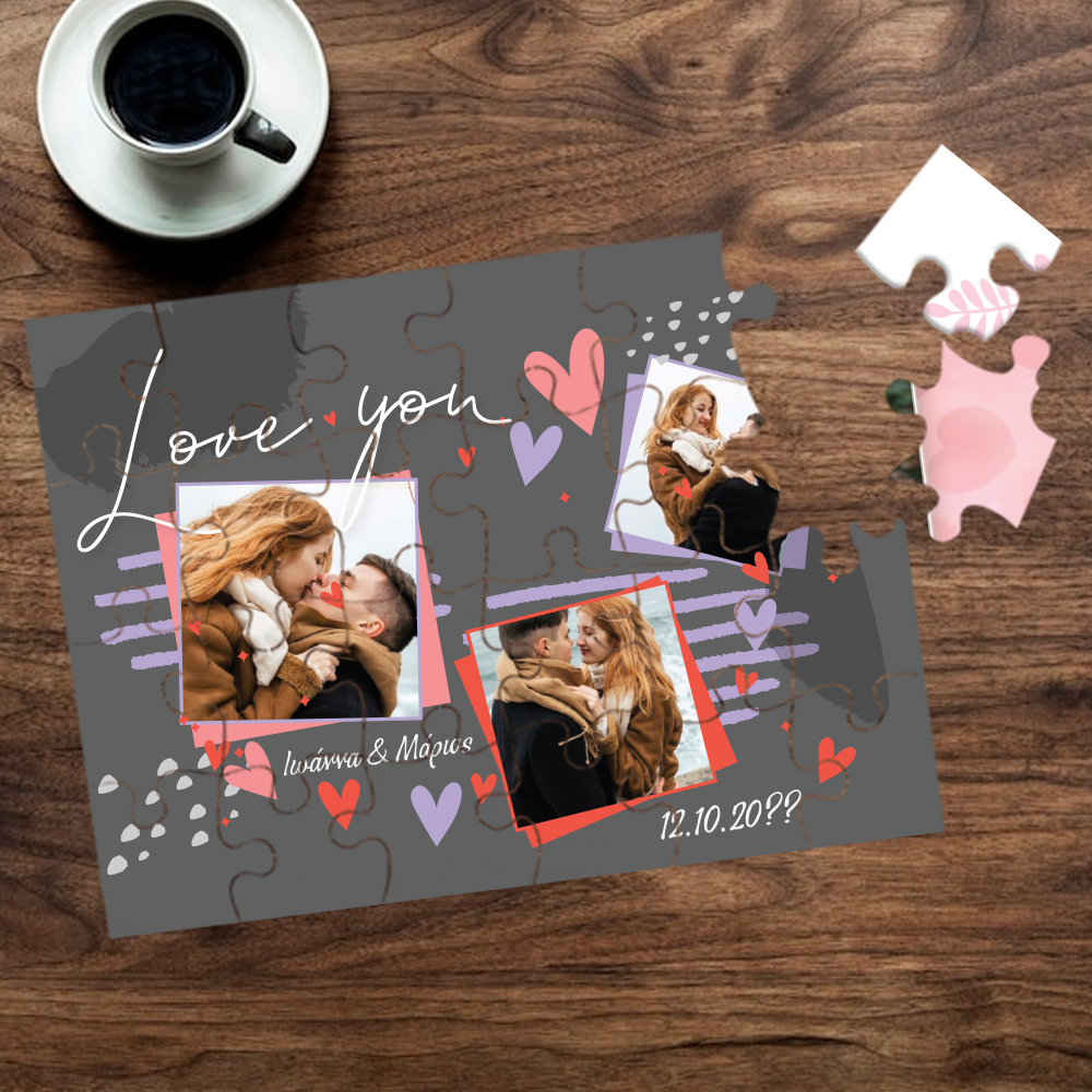 Πρωτότυπο Προσωποποιημένο Παζλ με τρεις αγαπημένες φωτογραφίες Ονόματα, Μήνυμα Δώρο για Ερωτευμένους που ξεχωρίζει, για την γιορτή του Αγίου Βαλεντίνου ή την επέτειο ζευγαριού. Εκφράστε την αγάπη σας με ένα ξεχωριστό τρόπο και με ένα μοναδικό δώρο το Προσωποποιημένο Με Φωτογραφία, με Ονόματα, Μήνυμα, για την επέτειο 1 ετους, 2, 3, 4, 5 ετων σχέσης κάθε ζευγαριου.