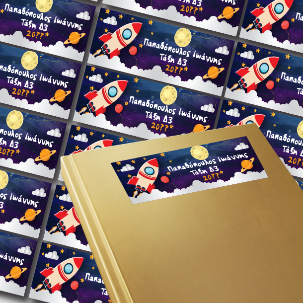 Αυτοκόλλητες Ετικέτες με Πύραυλο για Βιβλία, Τετράδια με Όνομα και Τάξη Προσωποποιημένες δώρο με αφορμή τα γενέθλια ή την γιορτή κάθε παιδιού του δημοτικού σχολείου και να ξεχωρίσει από όλα τα άλλα δώρα αμέσως, γιατί είναι προσωπικό και ξεχωριστό.