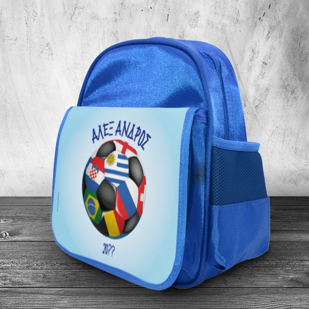 Ένα μοναδικό δώρο για κάθε αγόρι για την νέα σχολική χρονιά, Μπάλα με σημαίες σε Τσάντα Πλάτης με Όνομα, Έτος για Αγόρι, για αγόρια που θα πάνε Νηπιαγωγείο θα ξεχωρίσει τη νέα σχολική χρονιά από όλες τις υπόλοιπες σχολικές τσάντες στην τάξη.