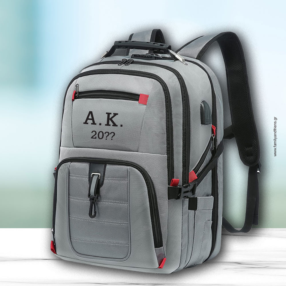 Ένα μοναδικό προσωποποιημένο δώρο για αγόρια και άνδρες, Σακίδιο Πλάτης, Backpack για ταξίδια, Σχολείο με Αρχικά, USB φορτιστή και AUX για ακουστικά με διαστάσεις περίπου 12 Χ 29 Χ 48.