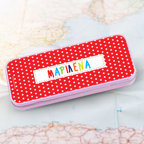 Σχολική Κασετίνα με πουά, Μεταλλική με Χρωματιστό Όνομα