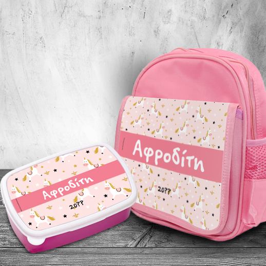 Σετ με Μονόκερους, Τσάντα Πλάτης με Τάπερ φαγητού με Όνομα