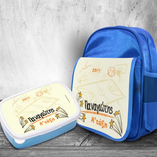 Σετ για Νηπιαγωγείο Τσάντα με Τάπερ Κολατσιού, Μπάλα Μπάσκετ με Όνομα, Ένα πρωτότυπο δώρο της νονάς για την νέα σχολική χρονιά για κάθε αγόρι που θα πάει στο νηπιαγωγείο.