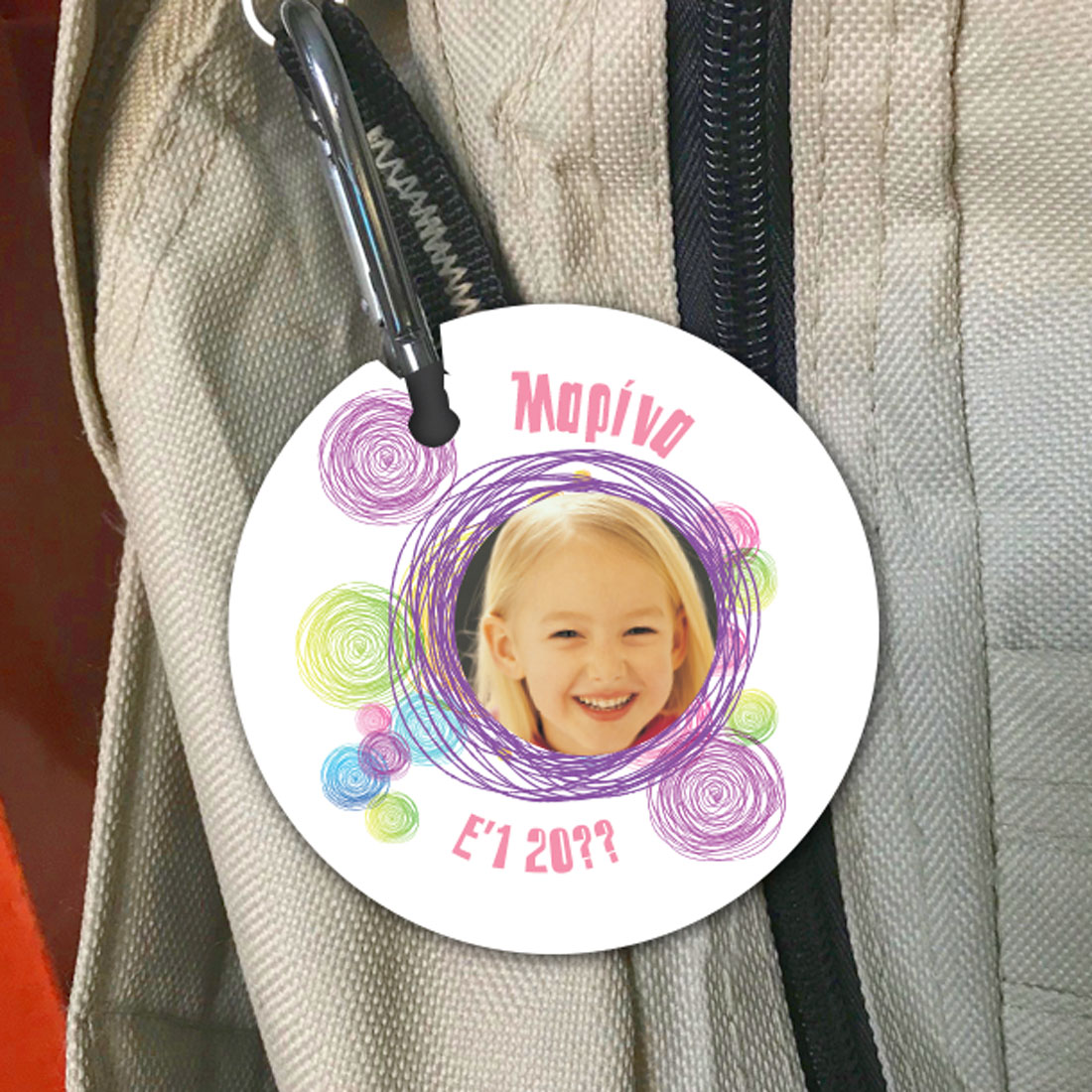 Προσωποποιημένο Στρογγυλό με Φωτογραφία, Όνομα Ταμπελάκι Τσάντας, για κορίτσι, αγόρι στο δημοτικό ή το νηπιαγωγείο είναι το δώρο που μπορεί να κάνει η θεία στο ανηψάκι της και η γιαγιά στο αγαπημένο της εγγονάκι!