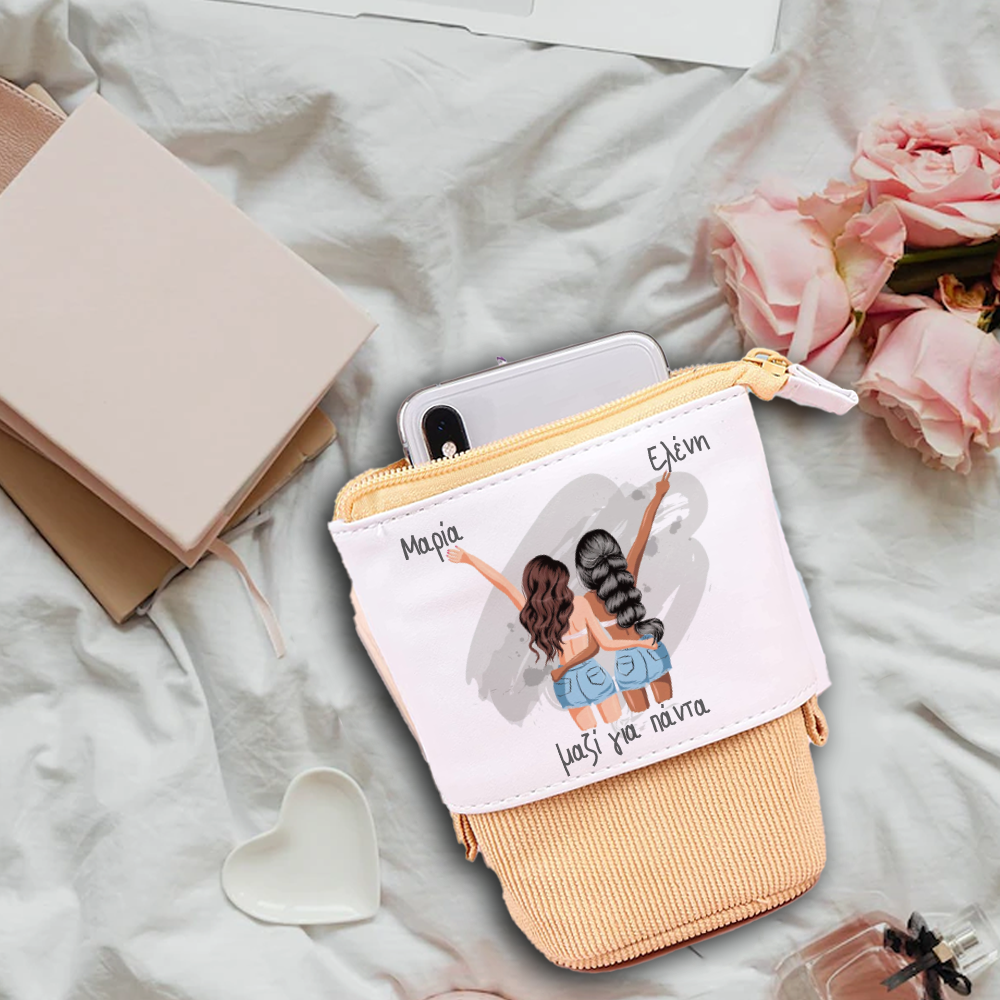 Πτυσσόμενη Μολυβοθήκη, Κασετίνα με σκίτσο φίλες, Όνομα, Τάξη προσωποποιημένη από κοτλέ ύφασμα & PU δέρμα σε τρία χρώματα Ώχρα, Σιελ, Ροζ.