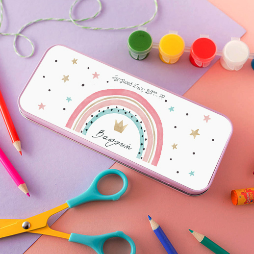Η Προσωποποιημένη Μεταλλική Κασετίνα Σχολική με Ουράνιο Τόξο, Όνομα, Έτος, για κορίτσια για όλες τις τάξεις στο Δημοτικό για αγορια του δημοτικου σχολειου είναι το διαφορετικό δώρο για το ξεκίνημα της σχολικής χρονιάς που θα ξεχωρίζει στην σχολική τσάντα κάθε μαθητή ή μαθητριας.