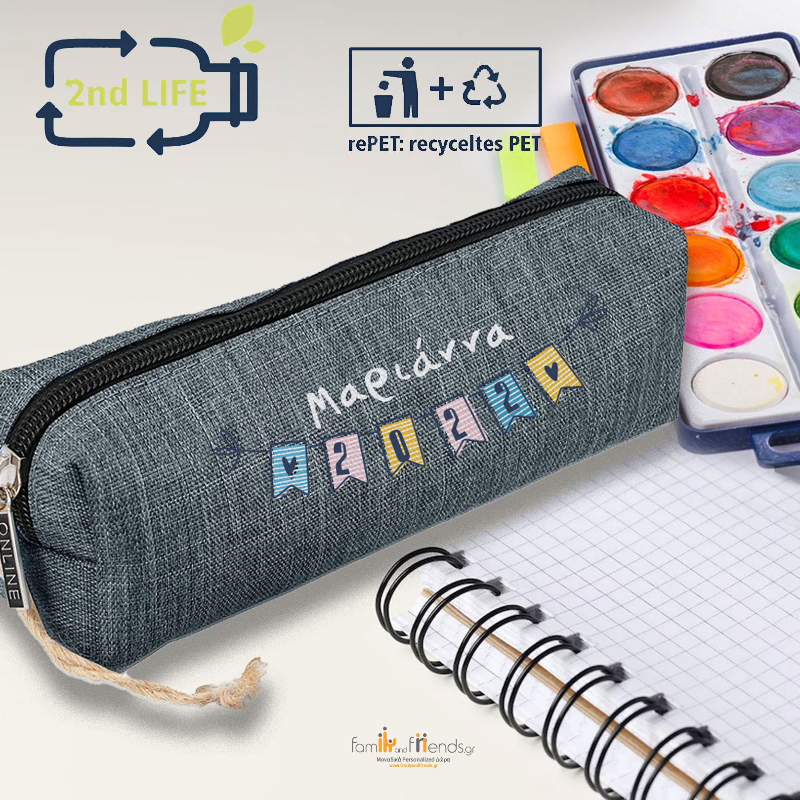Σχολική Κασετίνα βαρελάκι από ανακυκλωμένο PET με Όνομα, Τάξη, Προσωποποιημένο, διαφορετικό δώρο για την νέα σχολική χρονιά σε κάθε μαθητή, μαθήτρια, αγόρι και κορίτσι.