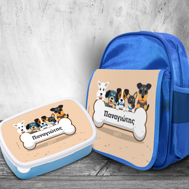 Τσάντα Πλάτης Νηπιαγωγείου & Τάπερ με Σκυλάκια, σετ με Όνομα