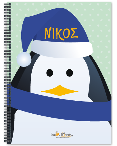 Χριστουγεννιάτικο Δώρο Τετράδιο Σπιράλ με Όνομα και Πιγκουίνο για δώρο στις γιορτές για παιδιά από 5 έως 8 ετών από την γιαγιά και τον παππού. Ένα Χριστουγεννιάτικο Δώρο Τετράδιο Σπιράλ με Όνομα και Πιγκουίνο για παιδιά στο δημοτικό ηλικίας 7 ετών, 8 ετών, 9 ετών ή 10 ετών. ΠΕΡΙΓΡΑΦΗ ΠΡΟΙΟΝΤΟΣ Τετράδιο Σπιράλ Α4 με γραμμές, Εξώφυλλο Τετράχρωμο με πλαστικοποίηση δύο όψεων σε εξώφυλο, οπισθόφυλλο. Ενός θέματος με περίπου 70 σελίδες με γραμμές Δύο θεμάτων με περιπου 120 σελίδες Τετράχρωμη εκτύπωση Το χρώμα του κουτιού στην συσκευασία δώρου εξαρτάται από την διαθεσιμότητα