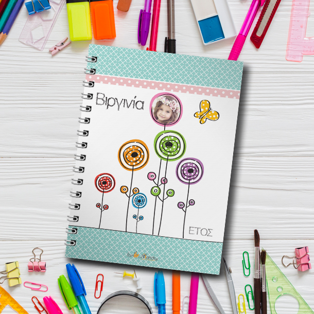 Προσωποποιημενο Τετράδιο Σπιράλ Α4 με λουλούδια, φωτογραφία, Όνομα, έτος για Αγόρια, κορίτσια που πηγαίνουν στο δημοτικό ή το γυνασιο στην Α’τάξη , Β’τάξη , Γ’τάξη μπορεί να είναι το πρωτότυπο δώρο που θα κάνει η νονά στο βαπτιστήρι της, η θεία στο ανιψάκι της, η γιαγια στο αγαπημένο της εγγονάκι.
