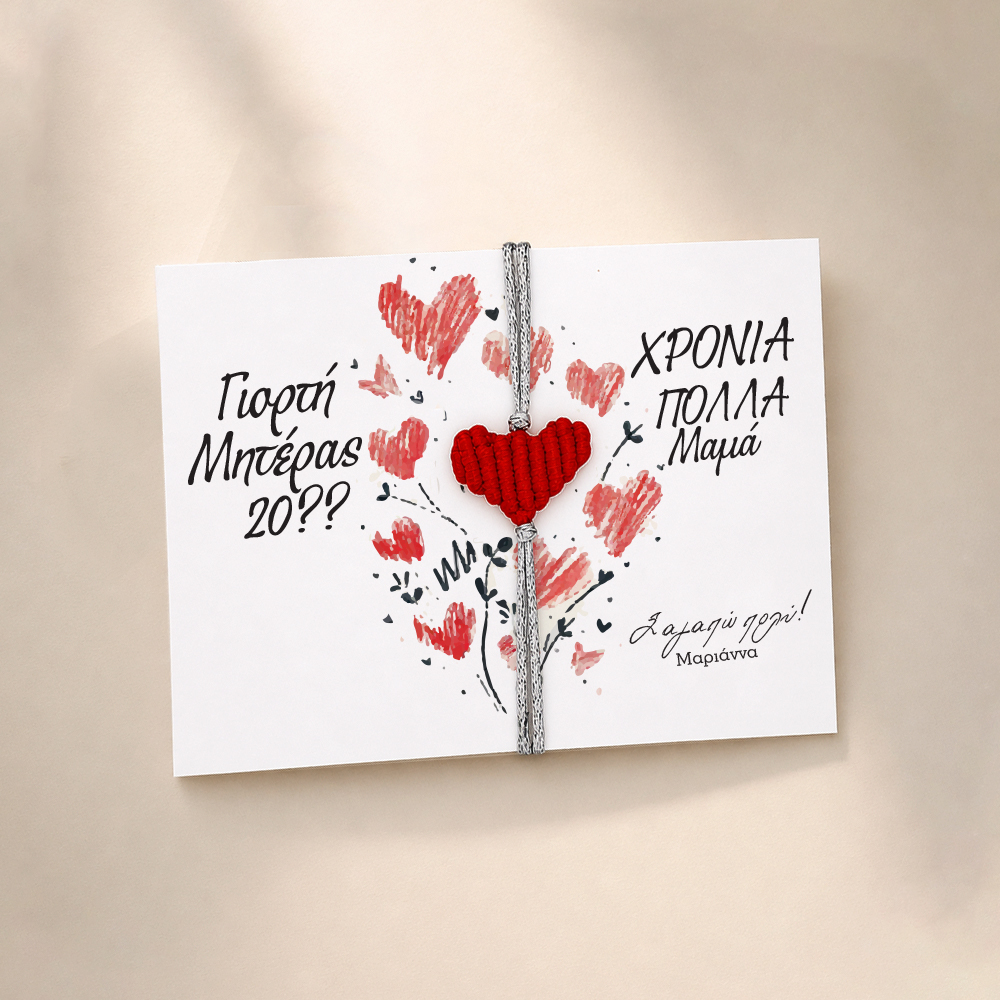 Ψάχνεις ένα δώρο που να ξεχωριζει πραγματικά για την Γιορτή της Μητέρας; Το χειροποίητο Βραχιόλι μακραμέ καρδιά για Μαμά σε καρτελάκι με Μήνυμα, δεν είναι απλώς ένα όμορφο αξεσουάρ, είναι ένα δώρο που θα φορά κάθε μέρα.
