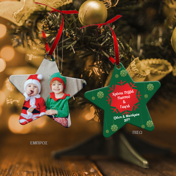 Το Πρωτότυπo Χριστουγεννιάτικo Αστέρι Μεταλλικό Στολίδι διπλής όψης, με Ευχές, Φωτογραφία, Ονόματα, είναι το διαφορετικό χριστουγεννιάτικο δώρο που θα κάνετε στο φίλο ή τη φίλη σας και θα στολίζει το σπίτι τους τις γιορτές.