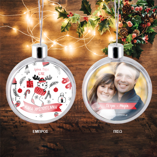 Αυτά τα Χριστούγεννα κάντα ένα μοναδικό προσωποποιημένο χριστουγεννιάτικο δώρο προσωποποιημενο με ονομα και φωτογραφία στον παππου, την γιαγια, την νονα, τον νονο, την θεια, τον θείο, τον μπαμπα, την μαμα. Η Πρωτότυπη Χριστουγεννιάτικη Διακοσμητική Μπάλα για το Δένδρο με Ευχή, Φωτογραφία δυο όψεων είναι το διαφορετικό χριστουγεννιάτικο δώρο που θα κάνετε είτε στον ευατό σας είτε στον παππού και την γιαγιά για να πείτε χρόνια πολλά με ένα γιαφορετικό και ξεχωριστό τρόπο. Μπάλα για το Δένδρο με Ευχή, Φωτογραφία δυο όψεων θα στολίζει το σπίτι της μαμας, μπαμπα όχι μόνο αυτές τις γιορτές αλλά και για πολλά ακόμα χρόνια, δημιουργώντας μοναδικές αναμνήσεις κάθε φορά που θα το βλέπουν. Αν αυτά τα Χριστούγεννα κρατήστε την οικογενεική μοναδική στιγμή για πάντα με την Διακοσμητική Μπάλα για το Δένδρο με Ευχή, Φωτογραφία δυο όψεων και διακοσμήστε το σπίτι σας με τα μοναδικά με στολίδια και μπάλες που ξεχωρίζουν από όλα όσα έχετε αγοράσει τα προηγούμενα Η Χριστουγεννιάτικη Διακοσμητική Μπάλα για το Δένδρο με Ευχή, Φωτογραφία δυο όψεων και έτος είναι το ξεχωριστό χριστουγεννιάτικο δώρο που θα κάνετε στην νονα, νονο ή την θεία, θειο για τις ευχές σας για τα χριστούγεννα και την νέα χρονιά και θα τους εντυπωσιάσει γιατί ξεχωρίζει από όλα τα άλλα και φτιάχνεται αποκλειστικά για αυτούς. Τα πρωτότυπα  Χριστουγεννιάτικα Στολίδια με Ευχή και έτος είναι το δώρο που θα κάνετε στην νονά ή την θεία και θα μείνει για πάντα θυμίζοντας την στιγμή που το προσφέρατε. Η Διακοσμητική Μπάλα για το Δένδρο με Ευχή, Φωτογραφία δυο όψεων Χριστούγεννα είναι ένα  ξεχωριστό και πρωτότυπο δώρο χριστουγεννων για κάθε μέλος της οικογένειας σας! Τα πρωτότυπα προσωποποιημένα Χριστουγεννιάτικα Στολίδια με Ευχή είναι ένα ξεχωριστό δώρο για τα χριστουγεννα ακόμα και για τον δάσκαλο ή  τη δασκάλα του παιδιού σας. ΠΕΡΙΓΡΑΦΗ ΠΡΟΙΟΝΤΟΣ Πρωτότυπη Διαφανής μπάλα για το Δέντρο και το σπίτι με ειδικό κλείσιμο Εικαστικό με 4 χρωμη εκτύπωση και στις δύο όψεις με 8cm διάμετρο που μπαίνει μέσα στην μπάλα που κουμπώνει με ειδικό τρόπο. Ασημί κούμπωμα και ασημένια κορδέλα ΔΙΑΣΤΑΣΕΙΣ 10cm διάμετρος