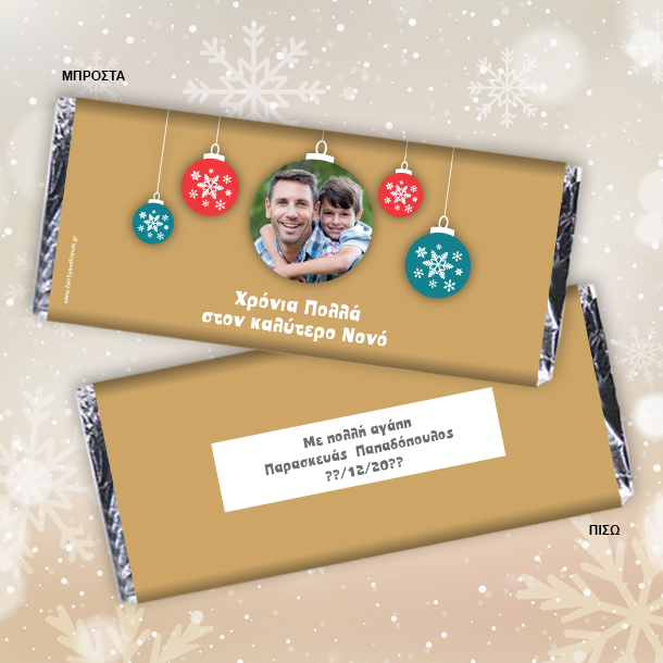 Η Χριστουγεννιάτικη Προσωποποιημένη Σοκολάτα Γιορτινή με Μπάλες σε γιορτινή Σοκολάτα, με Ευχές, Φωτογραφία, Ονόματα, Αφιέρωση, μπορεί να δοθεί σαν γιορτινό δώρο χριστουγέννων στην Γιαγιά, τον παπππού ή ακόμα και στον μπαμπά ή την Μαμά και θα είναι το δώρο εκπληξη που θα μείνει για πάντα αναμνηστικό στο σπίτι.