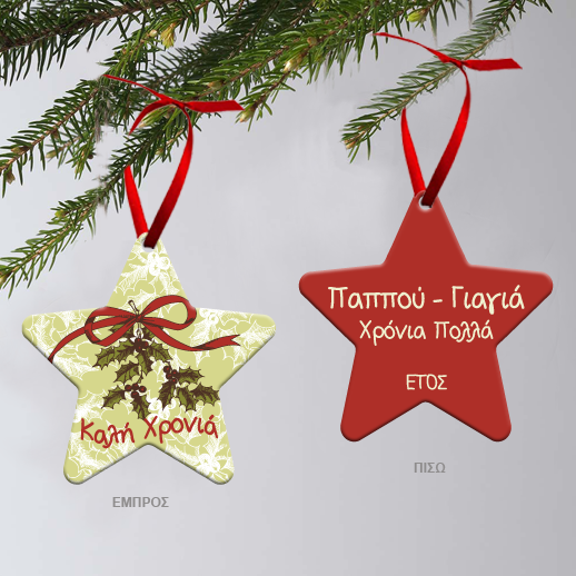 Αυτά τα χριστούγεννα διακοσμήστε το σπίτι σας με τα μοναδικά προσωποποιημενα χριστουγεννιατικα στολίδια που ξεχωρίζουν από όλα όσα έχετε αγοράσει τα προηγούμενα χρόνια. Τα Χριστουγεννιάτικα Στολίδια για τον Παππού - Γιαγιά με Ευχή είναι το διαφορετικό χριστουγεννιάτικο δώρο που θα κάνετε στον παππού και την γιαγια και θα στολίζει το σπίτι τους όχι μόνο αυτές τις γιορτές αλλά και για πολλά ακόμα χρόνια, δημιουργώντας μοναδικές αναμνήσεις κάθε φορά που θα το βλέπουν. Τα Χριστουγεννιάτικα Στολίδια για τον Παππού - Γιαγιά με Ευχή είναι το ξεχωριστό χριστουγεννιάτικο δώρο που θα κάνετε στον σε κάθε φίλο ή συγγενή και θα τους εντυπωσιάσει γιατί ξεχωρίζει από όλα τα άλλα και φτιάχνεται αποκλειστικά για αυτούς. Τα Χριστουγεννιάτικα Στολίδια με Ευχή και έτος είναι το δώρο που θα κάνετε στην νονά ή την θεία και θα μείνει για πάντα θυμίζοντας την στιγμή που το προσφέρατε. Το Χριστουγεννιάτικο Δώρο Τα Χριστουγεννιάτικα Στολίδια για τον Παππού - Γιαγιά με Ευχή ειναι ένα  ξεχωριστό και πρωτότυπο δώρο για κάθε οικογένεια. Τα προσωποποιημένα Χριστουγεννιάτικα Στολίδια με Ευχή είναι ένα ξεχωριστό χριστουγεννιάτικο δώρο και για τον δάσκαλο ή δασκάλα του παιδιού σας. ΠΕΡΙΓΡΑΦΗ ΠΡΟΙΟΝΤΟΣ Πρωτότυπα Χριστουγεννιάτικά διακοσμητικά στολίδια για το Δέντρο και το σπίτι 4 χρωμη εκτύπωση και στις δύο όψεις ΣΧΗΜΑΤΑ & ΔΙΑΣΤΑΣΕΙΣ Αστέρι 96 x 101mm Μπάλα 84 x 84 mm Χριστουγεννιάτικο Δέντρο 86 x 100mm