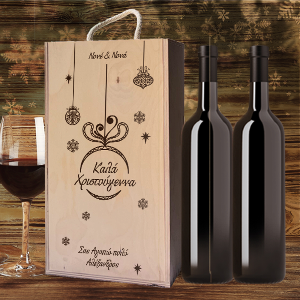 Ενα πρωτότυπο και Προσωποποιημένο Χριστουγεννιάτικο Ξύλινο Κουτί Κρασιού για δύο Μπουκάλια που θα κανετε στις δωρο στις γιορτές και σίγουρα θα δημιουργεί μοναδικές αναμνήσεις στον νονό για πολλά χρόνια. Το Χριστουγεννιάτικο Δώρο Προσωποποιημένο Χριστουγεννιάτικο Ξύλινο Κουτί Κρασιού για δύο Μπουκάλια με Χριστουγεννιάτικη Μπάλα με όνοματα και ευχές είναι το δώρο που φτιάχνεται αποκλειστικά για το Νονό, Νονά, ή όποιον άλλο φίλο ή συγγενή περάσετε μαζί τις γιορτές, με ημερομηνία και αφιέρωση για τις ημερες των χριστουγέννων ή της πρωτοχρονιάς. Το μοναδικό Δώρο για τα χριστουγεννα Προσωποποιημένο Χριστουγεννιάτικο Ξύλινο Κουτί Κρασιού για δύο Μπουκάλια, είναι το προσωποποιημένο δώρο που φτιάχνεται χειροποίητα αποκλειστικά για όποιον εσείς αποφασίσετε να κάνετε το δώρο. Χριστουγεννιάτικο Ξύλινο Κουτί Κρασιού για δύο Μπουκάλια για να το δώσετε αναμνηστικό τις ημέρες των γιορτών γιατί είναι το δώρο έξω από τα συνηθισμένα για τον θείο την θεία, τον παππού ή την γιαγιά. Το Χριστουγεννιάτικο Προσωποποιημένο Ξύλινο Κουτί Κρασιού, για δύο Μπουκάλια θα εντυπωσιάσει κάθε μπαμπα ή μαμα αν τους το προσφερερε αυτά τα χριστούγεννα και θα κρατηθεί σαν αναμνηστικό για πάντα θυμίζοντας την μοναδική στιγμή. Επίσης το Δώρο Ξύλινο Κουτί για Κρασί μπορεί να είναι ένα ξεχωριστό δώρο για όποιον γιορτάζει τις ημέρες αυτων των χριστουγέννων. ΔΕΙΤΕ ΤΑ ΚΡΑΣΙΑ ΠΟΥ ΧΡΗΣΙΜΟΠΟΙΟΥΜΕ ΠΕΡΙΓΡΑΦΗ ΕΠΙΛΟΓΩΝ Α. Ξύλινο Κουτί για 2 Μπουκάλια Κρασί με ειδική Προσωποποιημένη εκτύπωση Ξύλινο κουτί για ένα μπουκάλι κρασί Διάσταση 20cm X 34,5cm Χ 9,8cm Β. Με Κόκκινο Κρασί Ξύλινο Κουτί με ειδική Προσωποποιημένη εκτύπωση και 2 Μπουκάλια Κόκκινο Κρασί Γ. Με Λευκό Κρασί Ξύλινο Κουτί με ειδική Προσωποποιημένη εκτύπωση και 2 Μπουκάλια Λευκό Με ένα κλικ: ΔΕΙΤΕ ΤΑ ΚΡΑΣΙΑ ΠΟΥ ΧΡΗΣΙΜΟΠΟΙΟΥΜΕ