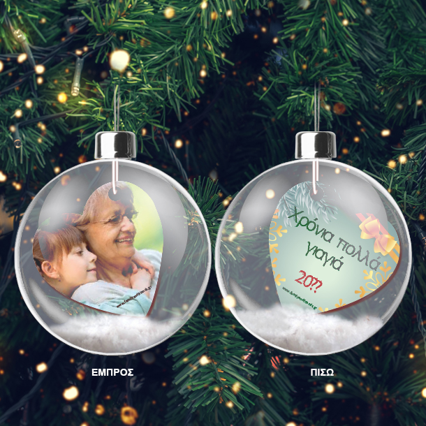 Αυτά τα Χριστούγεννα κάντα ένα μοναδικό προσωποποιημένο χριστουγεννιάτικο δώρο προσωποποιημενο με ονομα και φωτογραφία στον παππου, την γιαγια, την νονα, τον νονο, την θεια, τον θείο, τον μπαμπα, την μαμα. Η Πρωτότυπη Χριστουγεννιάτικη Διακοσμητική Μπάλα με Ευχές και Φωτογραφία για το Δένδρο, δυο όψεων είναι το διαφορετικό χριστουγεννιάτικο δώρο που θα κάνετε είτε στον ευατό σας είτε στον παππού και την γιαγιά για να πείτε χρόνια πολλά με ένα γιαφορετικό και ξεχωριστό τρόπο. Μπάλα με Ευχές και Φωτογραφία για το Δένδρο, δυο όψεων θα στολίζει το σπίτι της μαμας, μπαμπα όχι μόνο αυτές τις γιορτές αλλά και για πολλά ακόμα χρόνια, δημιουργώντας μοναδικές αναμνήσεις κάθε φορά που θα το βλέπουν. Αν αυτά τα Χριστούγεννα κρατήστε την οικογενεική μοναδική στιγμή για πάντα με την Διακοσμητική Μπάλα με Ευχές και Φωτογραφία για το Δένδρο, και διακοσμήστε το σπίτι σας με τα μοναδικά με στολίδια και μπάλες που ξεχωρίζουν από όλα όσα έχετε αγοράσει τα προηγούμενα Η Χριστουγεννιάτικη Διακοσμητική Μπάλα για το Δένδρο με Ευχή, Φωτογραφία δυο όψεων και έτος είναι το ξεχωριστό χριστουγεννιάτικο δώρο που θα κάνετε στην νονα, νονο ή την θεία, θειο για τις ευχές σας για τα χριστούγεννα και την νέα χρονιά και θα τους εντυπωσιάσει γιατί ξεχωρίζει από όλα τα άλλα και φτιάχνεται αποκλειστικά για αυτούς. Τα πρωτότυπα  Χριστουγεννιάτικα Στολίδια με Ευχή και έτος είναι το δώρο που θα κάνετε στην νονά ή την θεία και θα μείνει για πάντα θυμίζοντας την στιγμή που το προσφέρατε. Η Διακοσμητική Μπάλα με Ευχές και Φωτογραφία για το Δένδρο, δυο όψεων για το δένδρο τα Χριστούγεννα είναι ένα  ξεχωριστό και πρωτότυπο δώρο χριστουγεννων για κάθε μέλος της οικογένειας σας! Τα πρωτότυπα προσωποποιημένα Χριστουγεννιάτικα Στολίδια με Ευχή είναι ένα ξεχωριστό δώρο για τα χριστουγεννα ακόμα και για τον δάσκαλο ή  τη δασκάλα του παιδιού σας. Στο familyandfriends.gr θα βρείτε μοναδικά προσωποποιημένα δώρα γενεθλιων, γενεθλια και δώρα γιορτών προσωποποιημένα για αγόρια και κορίτσια, ανδρες, μαμα, μπαμπα, παππου, θειο, θεια, νονα, νονο και γυναίκες και καθε φιλο η συγγενή. Προσωποποιημένα δώρα με Ονόματα, έτος πρωτότυπα και οικονομικά δώρο χριστουγεννων που μπορείτε να κάνετε στισ γιορτές που θα εντυπωσιάσει κάθε συγγενή, για να του δείξετε ότι τον θυμηθήκατε και πόσο πολύ τον αγαπάτε! Μπάλες και στολίδια Χριστουγεννιάτικο Δώρο με Ευχές προσωποποιημένο με όνομα, Ονόματα, είναι ένα δώρο για τα χριστουγεννα που θα μείνει για πάντα και θα δημιουργεί κάθε φορά μοναδικές αναμνήσεις στην αγαπημένη σας θεια, γιαγια, νονα, μαμα. ΠΕΡΙΓΡΑΦΗ ΠΡΟΙΟΝΤΟΣ Πρωτότυπη Διαφανής μπάλα με καρδιά ξύλινη διπλής όψης και χιόνι στο εσωτερικό της. Εικαστικό με 4 χρωμη εκτύπωση και στις δύο όψεις σε καρδιά διαστάσεων περίπου 5 cm X 5 cm Ασημί κούμπωμα ΔΙΑΣΤΑΣΕΙΣ ΜΠΑΛΑΣ 10cm διάμετρος Το χρώμα της συσκευασίας δώρου εξαρτάται από την διαθεσιμότητα