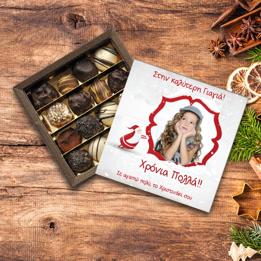 Γιορτινό Κουτί Σοκολατάκια με Φωτογραφία και όνομα μπορεί να δοθεί σαν γιορτινό δώρο χριστουγέννων στην Νονά, στην Γιαγιά, τον παπππού ή ακόμα και στον μπαμπά ή την Μαμά και θα είναι το δώρο εκπληξη που θα μείνει για πάντα αναμνηστικό στο σπίτι.