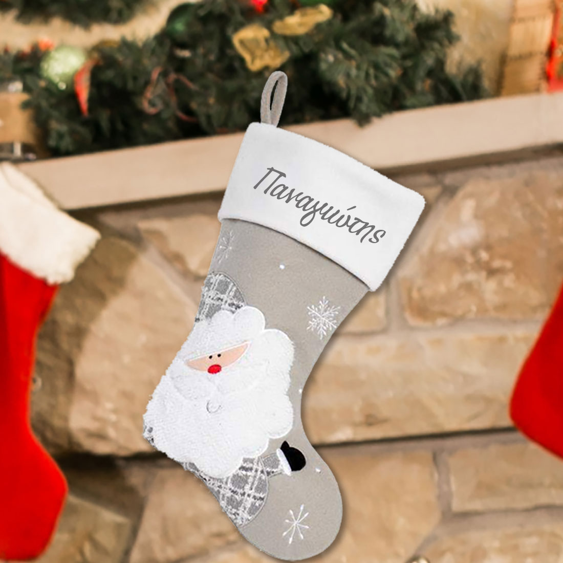 Καλτσα, Μπότα με Άι Βασίλη Γκρι, Διακοσμητική με Όνομα, Χριστουγεννιάτικη Διακοσμητική με Έτος, Δώρο Χριστουγέννων για παιδιά.