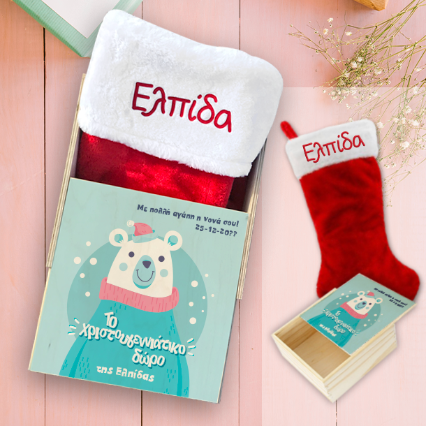 Ξύλινο Κουτί με Χριστουγεννιάτικη Μπότα, με Ευχές, Όνομα