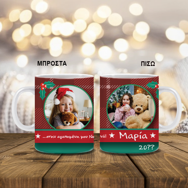 Το Προσωποποιημένο Δώρο Γιορτινή Kούπα Χριστουγεννιάτικη με 2 Φωτογραφίες, Ονόματα, Μήνυμα, για Χρόνια Πολλά, για τις γιορτές των χριστουγένννων, μπορεί να είναι το δώρο σας, στην νονα, θεία.