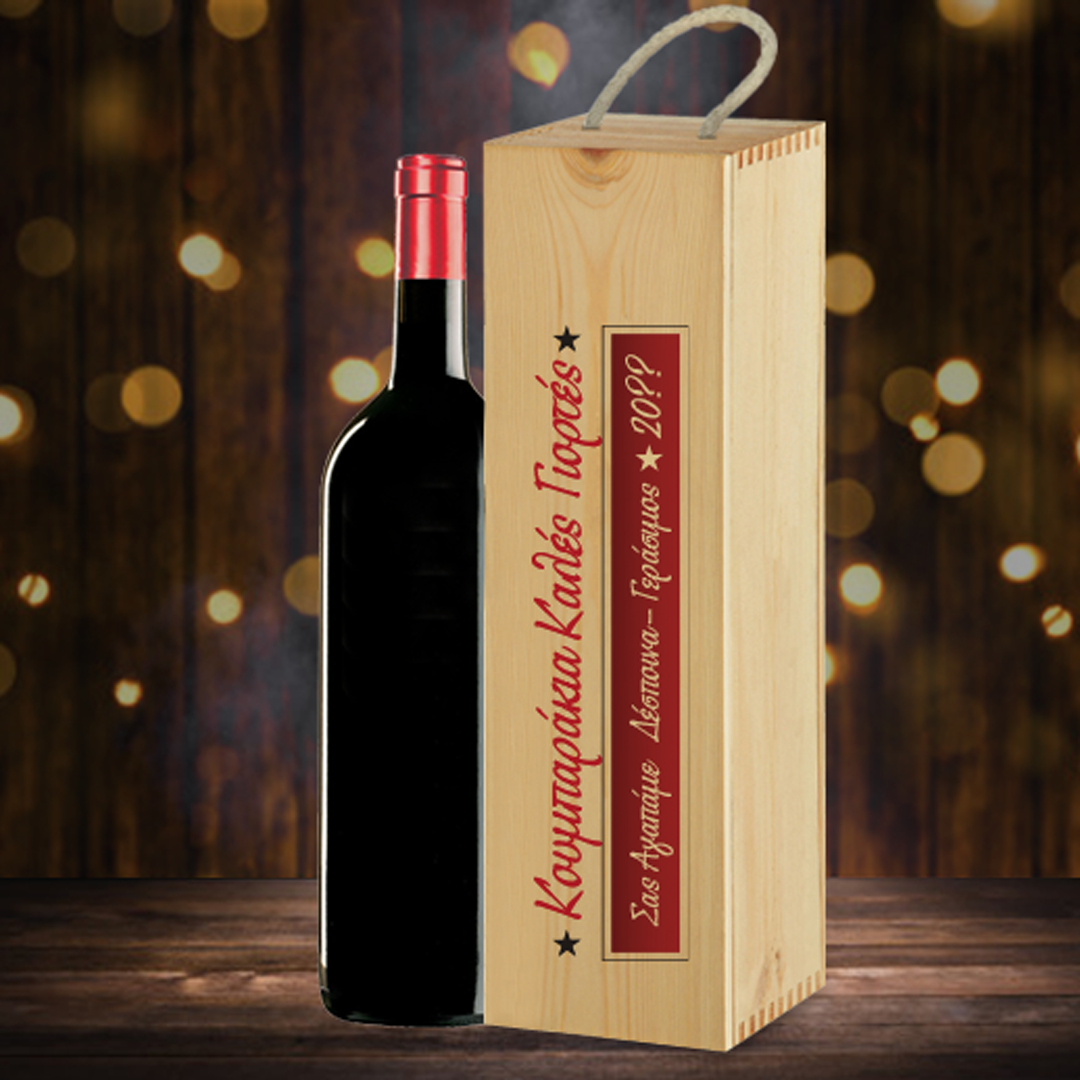 Το Προσωποποιημένο Γιορτινό Δώρο Κουτί με Κρασί Ξύλινο με Ευχές, Μήνυμα, Ημερομηνία, για κάθε αφορμή, δώρο που μπορείτε να κάνετε στην Γιαγιά με αφορμή τις γιορτές των Χριστουγέννων! Δώρο Κουτί με Κρασί Ξύλινο με Ευχές, Μήνυμα, Ημερομηνία, Προσωποποιημένο με το μήνυμα που θέλετε είναι ένα μοναδικό και οικονομικό δώρο για κάθε άνδρα με αφορμή τα γενέθλια του, ή την ονομαστική γιορτή της την περίοδο των Χριστουγέννων. Το Δώρο για τα Χριστούγεννα, Κουτί με Κρασί Ξύλινο με Ευχές, Ημερομηνία, Προσωποποιημένο, μπορεί να είναι το δώρο έκπληξη που θα κάνετε στην Μαμά ή τη Νονά  για δώρο Χριστουγέννων, Πρωτοχρονιάς. Το ξεχωριστό Δώρο για γενέθλια, Κουτί με Κρασί Ξύλινο με Ευχές, Μήνυμα, Ημερομηνία είναι το δώρο που θα στολίζει για πάντα το σπίτι των κουμπάρων που θα το χαρίσετε και θα δημιουργεί για πάντα μοναδικές αναμνήσεις σε όλους. Στα χειροποίητα δώρο γενεθλίων που  γράφετε ότι εσείς θέλετε  και φτιάχνεται κάθε φορά αποκλειστικά και μόνο για το πρόσωπο που επιθυμείτε να το χαρίσετε. Στα Προσωποποιημένα δώρα με ή χωρίς Φωτογραφία, για αγόρι ή κορίτσι, τον άνδρα ή τη γυναίκα μπορείτε να αλλάξετε τα κείμενα όπως εσείς θέλετε ανεξάρτητα από την δική μας πρόταση. Στο familyandfriends.gr θα βρείτε μοναδικά προσωποποιημένα δώρα γενεθλιων, γενεθλια και δώρα γιορτών προσωποποιημένα για αγόρια και κορίτσια, ανδρες, μαμα, μπαμπα, παππου, θειο, θεια, νονα, νονο και γυναίκες και καθε φιλο η συγγενή. Ένα πρωτότυπο και οικονομικό δώρο που μπορείτε να κάνετε με κάθε αφορμή στην Αδελφή σας, την κουμπάρα σας, που θα εντυπωσιάσει και θα δείξετε ότι την θυμηθήκατε και πόσο πολύ την αγαπάτε! Θα συμαντησετε την Νονά ή την Θεία στις Γιορτές των Χριστουγέννων? Κουτί με Κρασί Ξύλινο με Ευχές, Μήνυμα, Ημερομηνία, Μοναδικό δώρο για να τους ευχηθείτε χρόνια πολλά απλά αλλάζοντας τα κείμενα που σας προτείνουμε με όποια κείμενα θέλετε να γράψετε εσείς. Το Κουτί με Κρασί Ξύλινο με Ευχές, Μήνυμα, φτιάχνεται κάθε φορά αποκλειστικά μόνο για τον δικη σας, μαμα και μένει για πάντα αναμνηστικό γιατί έχει τα ονοματα και την ημερομηνία που προσφέρατε το δώρο. Μπορείτε επίσης να τη συνδυάσετε με μια προσωποποιημένη σοκολάτα Επίσης το Δώρο Ξύλινο Κουτί για Κρασί μπορεί να είναι ένα ξεχωριστό δώρο για όποιον γιορτάζει τις ημέρες αυτων των χριστουγέννων. ΠΕΡΙΓΡΑΦΗ ΕΠΙΛΟΓΩΝ Α. Ξύλινο Κουτί για 1 Κρασί με ειδική Προσωποποιημένη εκτύπωση Ξύλινο κουτί για ένα μπουκάλι κρασί Διάσταση 9,5cm X 34,5cm Χ 9,8cm Β. Με Κόκκινο Κρασί Ξύλινο Κουτί με ειδική Προσωποποιημένη εκτύπωση και ένα Κόκκινο Μπουκάλι Κρασί Γ. Με Λευκό Κρασί Ξύλινο Κουτί με ειδική Προσωποποιημένη εκτύπωση και ένα Λευκό Μπουκάλι Με ένα κλικ: ΔΕΙΤΕ ΤΑ ΚΡΑΣΙΑ ΠΟΥ ΧΡΗΣΙΜΟΠΟΙΟΥΜΕ