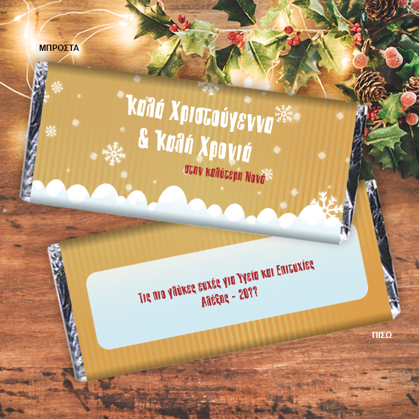 Χριστουγεννιάτικο Δώρο για τη Θεία, Με Νιφάδες Σοκολάτα με Ευχές, Ονόματα, Ημερομηνία και Αφιέρωση για Χρόνια Πολλά τα Χριστούγεννα και την πρωτοχρονιά, ένα ξεχωριστό και πρωτότυπο δώρο. Το πρωτότυπο Δώρο Χριστουγεννιάτικη Προσωποποιημένη Σοκολάτα με Όνομα για τις γιορτές των χριστουγένννων, μπορεί να είναι το δώρο σας, στην θεία και για κάθε φίλη ή φίλο σας! Με Νιφάδες Σοκολάτα με Ευχές, Ονόματα, Ημερομηνία, Προσωποποιημένη Χριστουγεννιάτικη δωρο στην Μαμά, τον Μπαμπά, ένα δώρο διαφορετικό από κάθε άλλο που έχετε κάνει μέχρι σήμερα, γιατί είναι προσωπικό και δημιουργεί μοναδικές αναμνήσεις για πάντα. Το Χριστουγεννιάτικο δώρο Προσωποποιημένη Με Νιφάδες Σοκολάτα με Ευχές, Ονόματα και Αφιέρωση, γιορτινό δώρο χριστουγέννων στην Γιαγιά και τον παπππού, θα είναι το δώρο εκπληξη που θα μείνει για πάντα αναμνηστικό στο σπίτι. Με Νιφάδες Σοκολάτα με Ευχές, Ημερομηνία Χριστουγεννιάτικη Σοκολάτα, είναι το δώρο που θα ξεχωρίσει από όλα τα άλλα που έχετε κάνει μέχρι σήμερα για τα χριστουγεννα ή την πρωτοχρονια κάθε φίλου ή συγγενή. Μπορείτε επίσης να τη συνδυάσετε με μια προσωποποιημένη κούπα για τον καφέ ή το τσάι Μπορείτε επίσης να τη συνδυάσετε την Προσωποποιημένη Σοκολάτα με Ευχές, Ονόματα, με ένα προσωποποιημένο φορμάκι για τα πρώτα χριστουγεννα του μωρού σας που θα κάνει αυτές τις γιορτές και ειδικά τα χριστουγεννα μοναδικά και αξέχαστα για πάντα. Στα Προσωποποιημένα δώρα χριστουγεννων με ή χωρίς Φωτογραφία, για την νονα ή τον νονο μπορείτε να αλλάξετε τα κείμενα όπως εσείς θέλετε ανεξάρτητα από την δική μας πρόταση. Το Προσωποποιημένo Δώρο, πρωτοτυπα χειροποιητα χριστουγεννιατικα δωρα, με Ευχές, με Όνομα, για τα χριστούγεννα, θα κρατηθεί σαν αναμνηστικό για πάντα από κάθε δάσκαλο ή δασκάλα. Το Προσωποποιημένο Δώρο για τις γιορτές στην Καλύτερη Θεία, Χριστουγεννιάτικη Προσωποποιημένη Σοκολάτα με Ευχές, Όνομα για Χρόνια Πολλά και καλή χρονιά είναι το ξεχωριστό δώρο για κάθε φίλο ή συγγενή στις γιορτές, είναι ένα ξεχωριστό δώρο για την αγαπημένη σας θεία ή θείο αυτά τα Χριστούγεννα! ΠΕΡΙΓΡΑΦΗ Σοκολάτα Γάλακτος 85 γρ Προσωποποιημένη 4χρωμη εκτύπωση Το χρώμα της συσκευασίας δώρου εξαρτάται από την διαθεσιμότητα