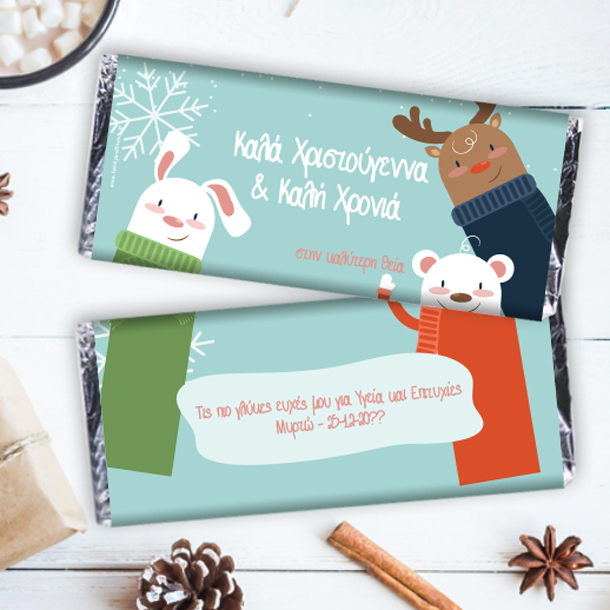 Προσωποποιημένη Χριστουγεννιάτικη Με ζωάκια Προσωποποιημένη Σοκολάτα με Ευχές, Ονόματα, δωρο στην Μαμά, τον Μπαμπά είναι ένα ξεχωριστό δώρο διαφορετικό από κάθε άλλο που έχετε κάνει μέχρι σήμερα, γιατί είναι προσωπικό και δημιουργεί μοναδικές αναμνήσεις για πάντα.