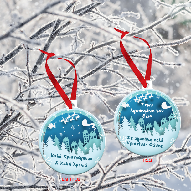Μεταλλικό Στολίδι με Χιονισμένο τοπίο, με Ευχές, Ονόματα, δύο όψεων, για να διακοσμήσετε αυτά τα χριστούγεννα το σπίτι σας.