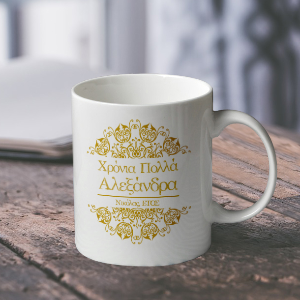 Προσωποποιημένη Λευκή Κούπα, με Μεταλλικό Χρυσό Δώρο για Χρόνια Πολλά, με το δικό σας κείμενο, την ευχή που θέλετε ημερομηνία και ονόματα είναι το δώρο που θα ξεχωρίσει απο όλα τα αλλα στην φετινή γιορτή της μητέρας γιατί είναι διαφορετικό από όλα όσα έχετε κάνει μέχρι σήμερα στην μαμα.