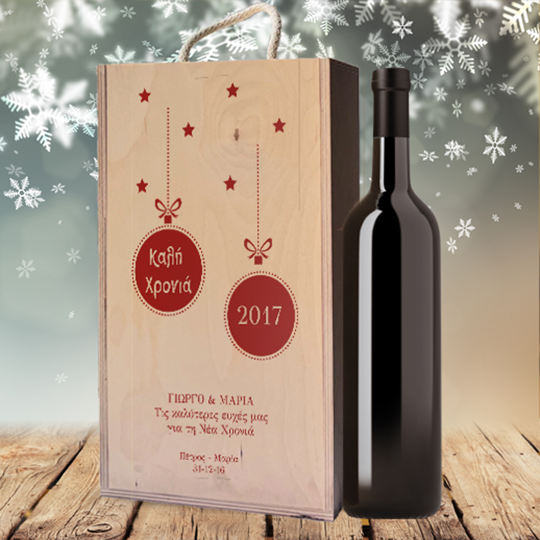 Ενα πρωτότυπο και Προσωποποιημένο Ξύλινο Κουτί Κρασιού, για δύο Μπουκάλια με Χριστουγεννιάτικη Μπάλα που θα κανετε στις δωρο στις γιορτές και σίγουρα θα δημιουργεί μοναδικές αναμνήσεις στον νονό για πολλά χρόνια. Το Χριστουγεννιάτικο Δώρο Προσωποποιημένο Ξύλινο Κουτί Κρασιού, για δύο Μπουκάλια με Χριστουγεννιάτικη Μπάλα με όνοματα και ευχές είναι το δώρο που φτιάχνεται αποκλειστικά για το Νονό, Νονά, ή όποιν άλλο φίλο ή συγγενή περάσετε μαζί τις γιορτές, με ημερομηνία και αφιέρωση για τις ημερες των χριστουγέννων ή της πρωτοχρονιάς. Το μοναδικό Χριστουγεννιάτικο Δώρο Προσωποποιημένο Ξύλινο Κουτί Κρασιού, για δύο Μπουκάλια, είναι το προσωποποιημένο δώρο που φτιάχνεται χειροποίητα αποκλειστικά για όποιον εσείς αποφασίσετε να κάνετε το δώρο, για να το δώσετε αναμνηστικό τις ημέρες των γιορτών γιατί είναι το δώρο έξω από τα συνηθισμένα για τον θείο την θεία, τον παππού ή την γιαγιά. Το Χριστουγεννιάτικο Προσωποποιημένο Ξύλινο Κουτί Κρασιού, για δύο Μπουκάλια θα εντυπωσιάσει κάθε μπαμπα ή μαμα αν τους το προσφερερε αυτά τα χριστούγεννα και θα κρατηθεί σαν αναμνηστικό για πάντα θυμίζοντας την μοναδική στιγμή. Επίσης το Δώρο Ξύλινο Κουτί για Κρασί μπορεί να είναι ένα ξεχωριστό δώρο για όποιον γιορτάζει τις ημέρες αυτων των χριστουγέννων. ΔΕΙΤΕ ΤΑ ΚΡΑΣΙΑ ΠΟΥ ΧΡΗΣΙΜΟΠΟΙΟΥΜΕ ΠΕΡΙΓΡΑΦΗ ΕΠΙΛΟΓΩΝ Α. Ξύλινο Κουτί για 2 Μπουκάλια Κρασί με ειδική Προσωποποιημένη εκτύπωση Ξύλινο κουτί για ένα μπουκάλι κρασί Διάσταση 20cm X 34,5cm Χ 9,8cm Β. Με Κόκκινο Κρασί Ξύλινο Κουτί με ειδική Προσωποποιημένη εκτύπωση και 2 Μπουκάλια Κόκκινο Κρασί Γ. Με Λευκό Κρασί Ξύλινο Κουτί με ειδική Προσωποποιημένη εκτύπωση και 2 Μπουκάλια Λευκό Με ένα κλικ: ΔΕΙΤΕ ΤΑ ΚΡΑΣΙΑ ΠΟΥ ΧΡΗΣΙΜΟΠΟΙΟΥΜΕ