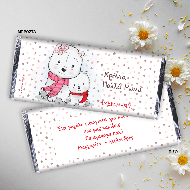 Προσωποποιημένη Σοκολάτα με αρκουδάκια για Χρόνια Πολλά με όνομα, ημερομηνία και αφιέρωση, ένα πρωτότυπο και ξεχωριστό δώρο για την Γιορτή της Μητέρας στην αγαπημένη σας Μαμά.