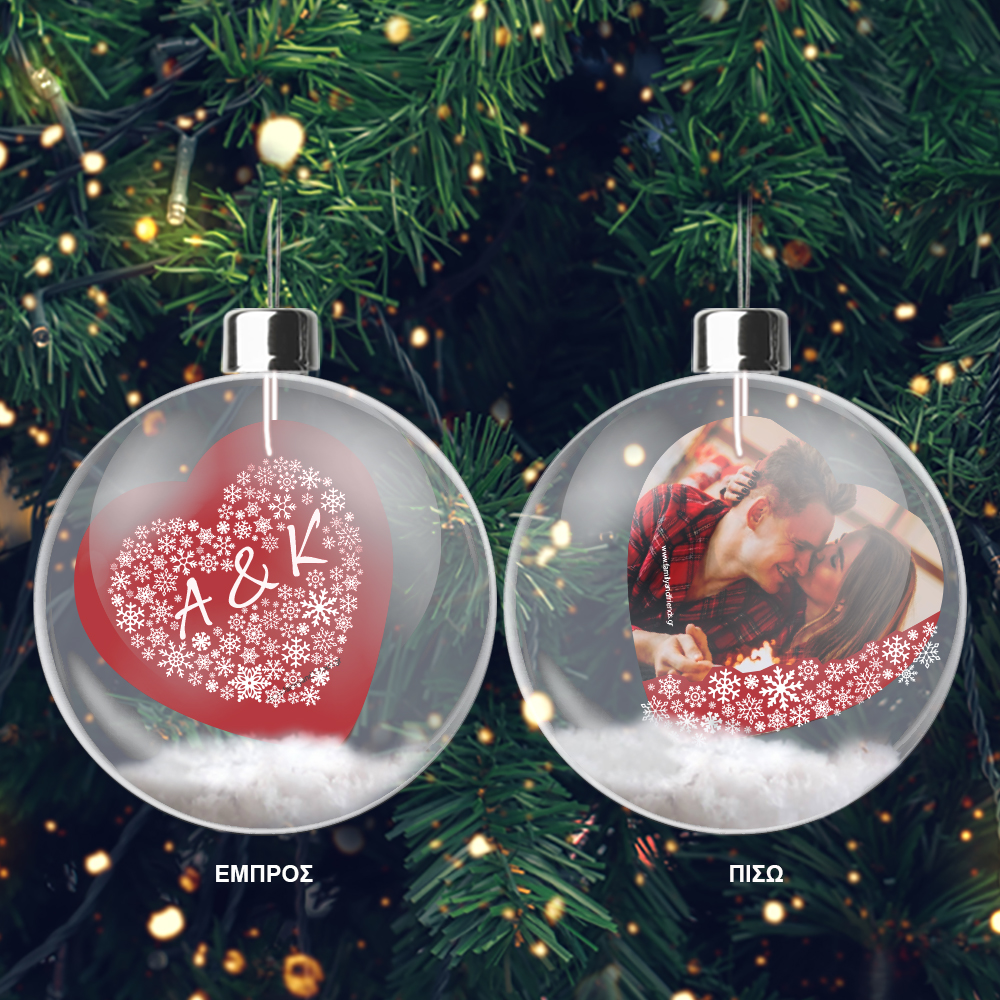 Ένα μοναδικό προσωποποιημένο χριστουγεννιάτικο Στολίδι Μπάλα με καρδιά στο εσωτερικό της, με Φωτογραφία για ζευγάρια. Πρωτότυπη Χριστουγεννιάτικη Μπάλα για το χριστουγεννιάτικο δένδρο, με καρδιά δυο όψεων που αιωρείται μέσα στην μπάλα & έχει χιόνι στη βάση της.