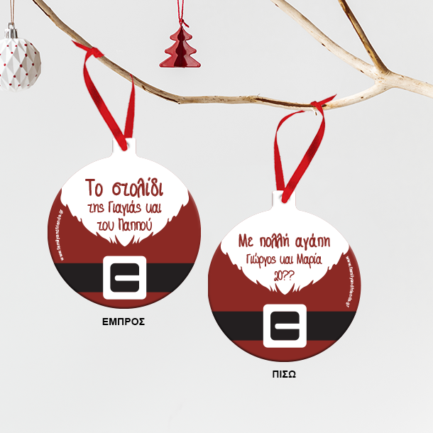 Το Χριστουγεννιάτικο δύο όψεων, Μεταλλικό Στολίδι ζώνη Άι Βασίλη, με Ευχές, Ονόματα, είναι το ξεχωριστό χριστουγεννιάτικο δώρο που θα κάνετε στον σε κάθε φίλο ή συγγενή και θα τους εντυπωσιάσει και φτιάχνεται αποκλειστικά για αυτούς μετά την παραγγελία σας. Το δώρο Χριστουγέννων Μεταλλικό Στολίδι ζώνη Άι Βασίλη, με Ευχές, Ονόματα, που θα κάνετε στην νονά ή την θεία και θα μείνει για πάντα θυμίζοντας την στιγμή που το προσφέρατε. Το προσωποποιημένο Δώρο για τα Χριστούγεννα, για το χριστουγεννιάτικο δένδρο, Μεταλλικό Στολίδι, με Ευχές, Ονόματα, για τον Μπαμπά και την Μαμα ειναι ένα ξεχωριστό και πρωτότυπο δώρο για κάθε οικογένεια.