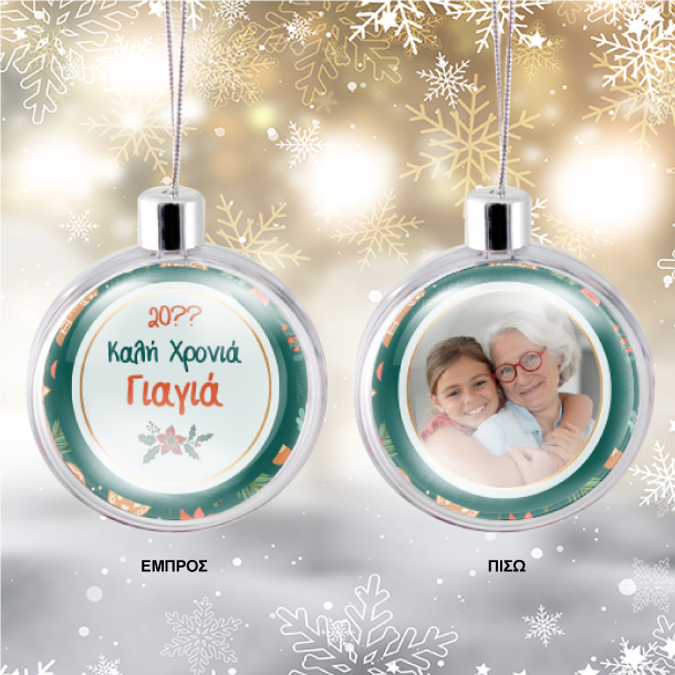 Πρωτότυπη Διαφανής μπάλα για το Δέντρο και το σπίτι με ειδικό κλείσιμο Εικαστικό με 4 χρωμη εκτύπωση και στις δύο όψεις με 8cm διάμετρο που μπαίνει μέσα στην μπάλα που κουμπώνει με ειδικό τρόπο. Ασημί κούμπωμα και ασημένια κορδέλα ΔΙΑΣΤΑΣΕΙΣ 10cm διάμετρος
