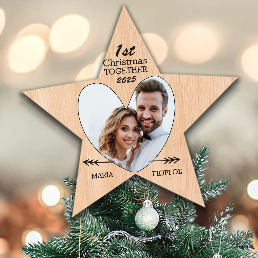 Τα πρώτα Χριστούγεννα μαζί, Με Φωτογραφία, Ονόματα Ξύλινο Αστέρι Κορυφή Χριστουγεννιάτικου Δένδρου, για το χριστουγεννιάτικο Δένδρο προσωποποιημένο, είναι το διαφορετικό δώρο που θα κάνετε στο αγόρι σας για τα πρώτα Χριστούγεννα που θα περάσετε μαζί, και θα στολίζει το σπίτι σας όχι μόνο αυτές τις γιορτές αλλά και για πολλά ακόμα χρόνια.